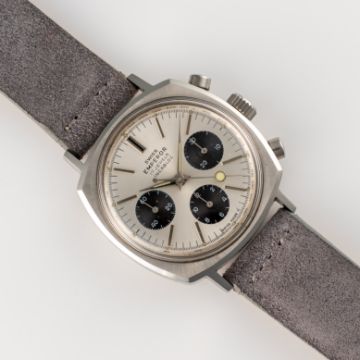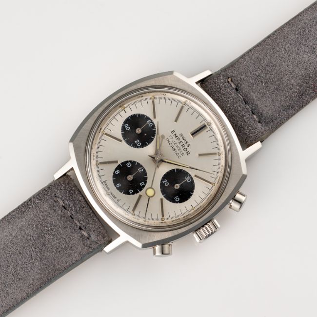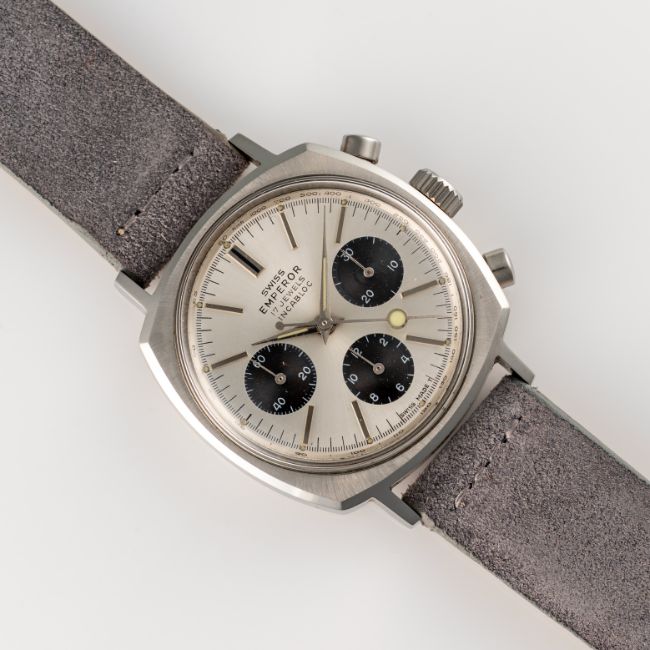 A GENTLEMAN'S SIZE STAINLESS STEEL SWISS EMPEROR CAMARO CHRONOGRAPH WRIST WATCH CIRCA 1970, WITH VALJOUX 72 MOVEMENT, "PANDA" DIAL & "LOLLIPOP" SECONDS HANDMovement: 17J, manual wind, Valjoux cal. 72.Case: Width approx. 37mm, "Camaro" case, screw back. Strap: Leather. CONDITION REPORTDial: Original dial in excellent condition.Movement: Running & functioning at present, timekeeping and accuracy cannot be guaranteed.Case: In excellent condition, with some light scratches due to general use.Strap/Bracelet: In excellent condition.