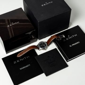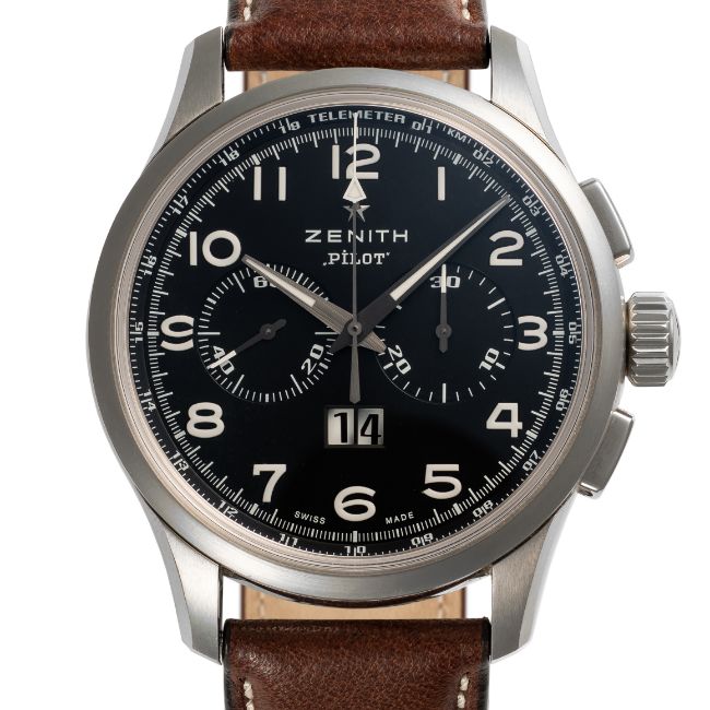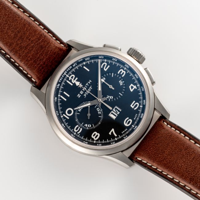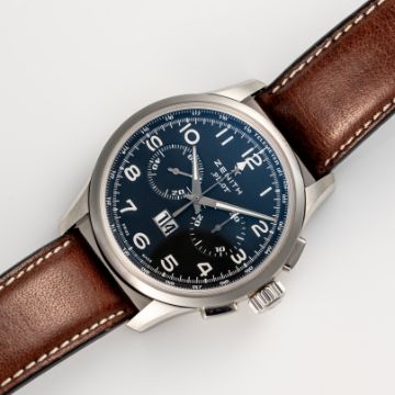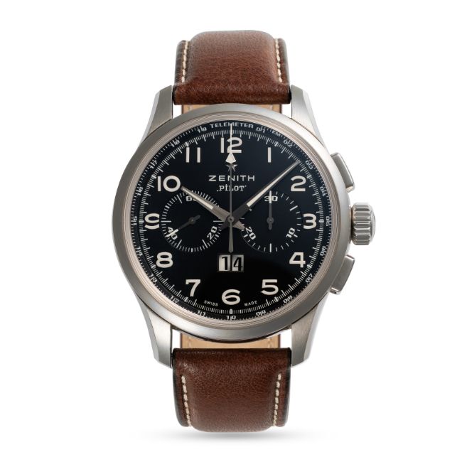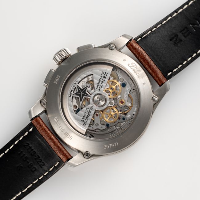 A GENTLEMAN'S SIZE STAINLESS STEEL ZENITH PILOT BIG DATE EL PRIMERO AUTOMATIC CHRONOGRAPH WRIST WATCH DATED 2014, REF. 03.2410.4010/21.C722 ACCOMPANIED BY THE ORIGINAL BOX, BOOKLET & WARRANTY CARD Movement: 31J, automatic, cal. 4010, signed Zenith.Case: Diameter approx. 42mm, exhibition back, marked Pilot, numbered, original crown and pushers.Strap: Zenith leather strap & folding clasp. CONDITION REPORTDial: Original dial in excellent condition. Movement: Running & functioning at present, timekeeping and accuracy cannot be guaranteed. Case: In excellent condition, with some light scratches due to general use. Strap/Bracelet: In very good condition.
