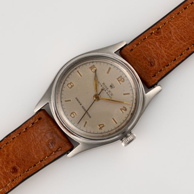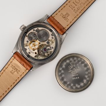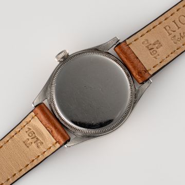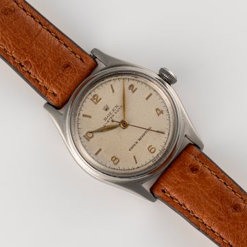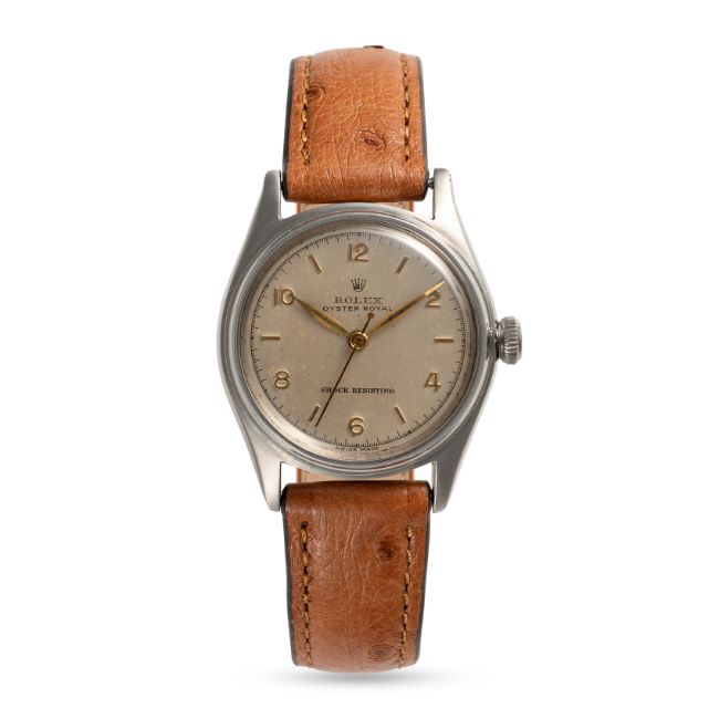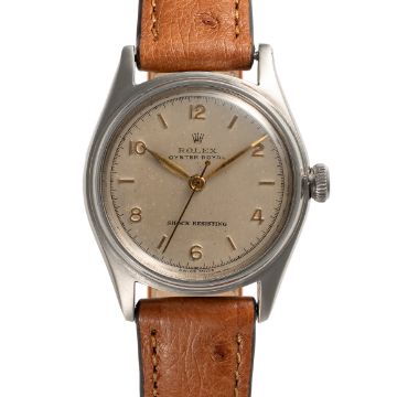 A MIDSIZE STAINLESS STEEL ROLEX OYSTER ROYAL SHOCK RESISTANT WRIST WATCHCIRCA 1947, REF. 4444Movement: 15J, manual wind, signed Rolex.Case: Diameter approx. 32mm, Oyster case, signed Rolex, numbered 59x,xxx, Oyster Patent crown.Strap: Leather. CONDITION REPORTDial: Original dial in very good condition, showing some signs of age.Movement: Running & functioning at present, timekeeping and accuracy cannot be guaranteed.Case: In good condition, with some scratches & wear due to general use.Strap/Bracelet: In very good condition.