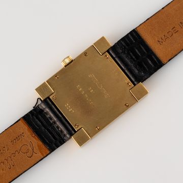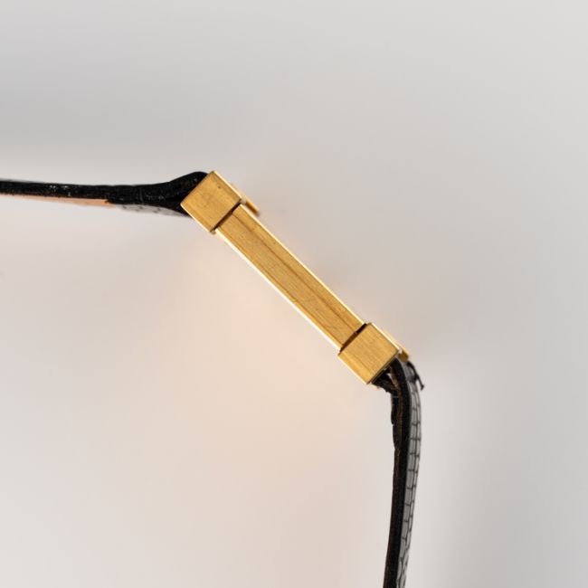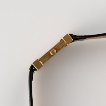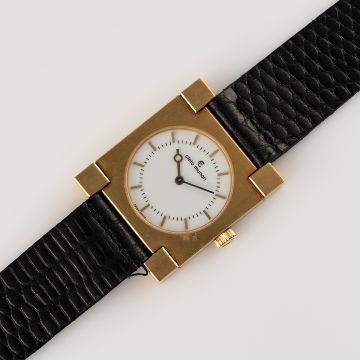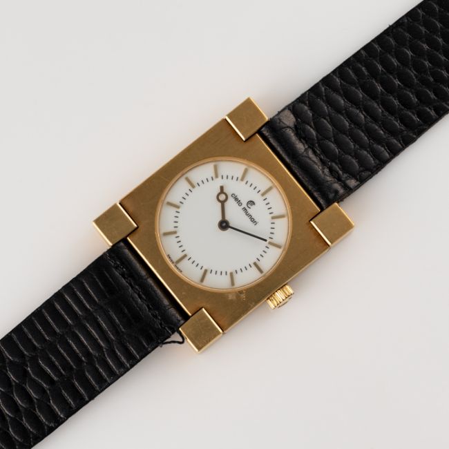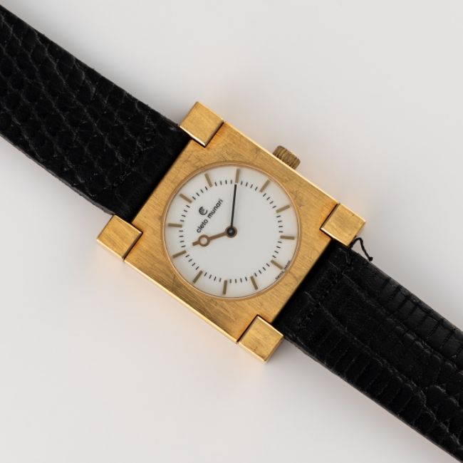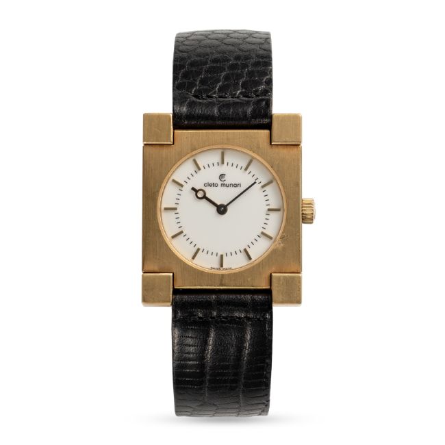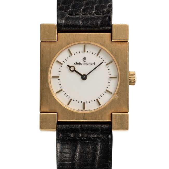 A RARE GENTLEMAN'S SIZE 18K SOLID GOLD CLETO MUNARI "SOTSEY" WRIST WATCHCIRCA 1980s, A LIMITED EDITION DESIGNED BY ETTORE SOTTSASS, ONE OF THE MOST SIGNIFICANT DESIGNERS & ARCHITECTS OF THE 20TH CENTURY Movement: 17J, manual wind, ultra slim Fredric Piguet cal. 9"21. Case: Width approx. 25mm, signed Ettore Sottsass de Cleto Munari, 18k hallmarks, original crown. Strap: Leather.  CONDITION REPORTDial: Original dial in excellent condition. Movement: Running & functioning at present, timekeeping and accuracy cannot be guaranteed. Case: In very good condition, with some light scratches due to general use. Strap/Bracelet: In very good condition.