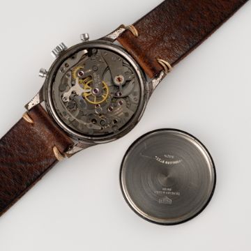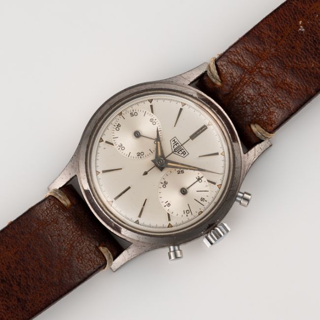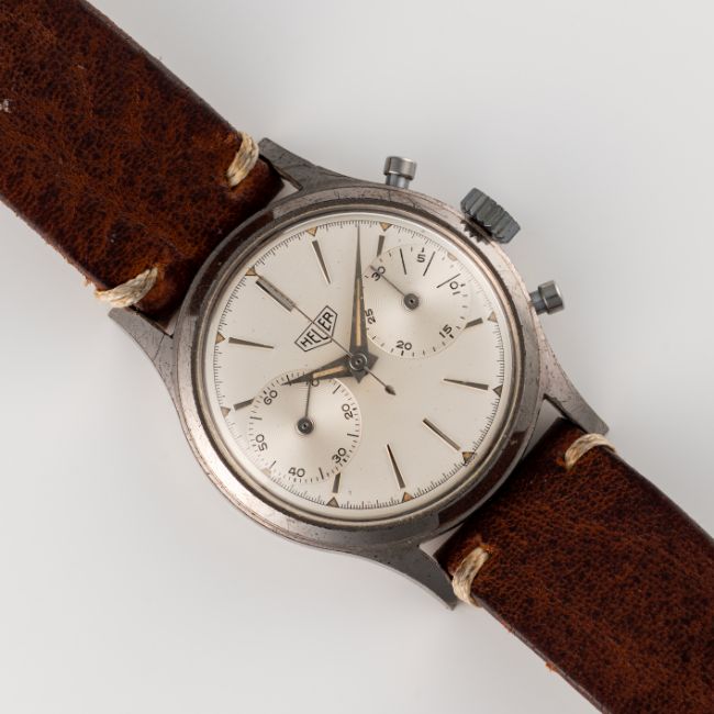 A GENTLEMAN'S SIZE HEUER "PRE CARRERA" CHRONOGRAPH WRIST WATCHCIRCA 1950s, REF. 3336S WITH "BIG EYE" SUB DIALSMovement: 17J, manual wind, Valjoux cal. 92, signed Ed Heuer & Co SA.Case: Diameter approx. 35mm, chrome plated top with a stainless steel screw back, signed Ed Heuer & Co.Strap: Leather. CONDITION REPORTDial: Original dial in excellent condition.Movement: Running & functioning at present, timekeeping and accuracy cannot be guaranteed.Case: In good condition, wear & scratches to the chrome plating.Strap/Bracelet: In very good condition.